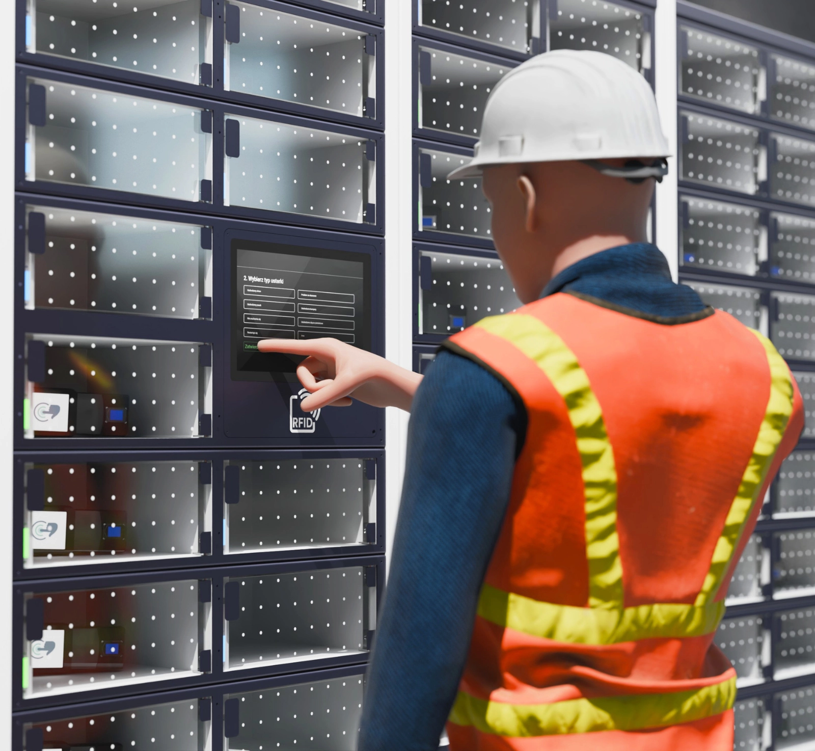 - zgłaszanie usterek sprzętu - użytkownik może przy zwrocie lub poborze sprzętu zgłosić problem, bezpośrednio na ekranie dotykowym szafy. System automatycznie wyśle powiadomienie do administratora IT lub serwisu