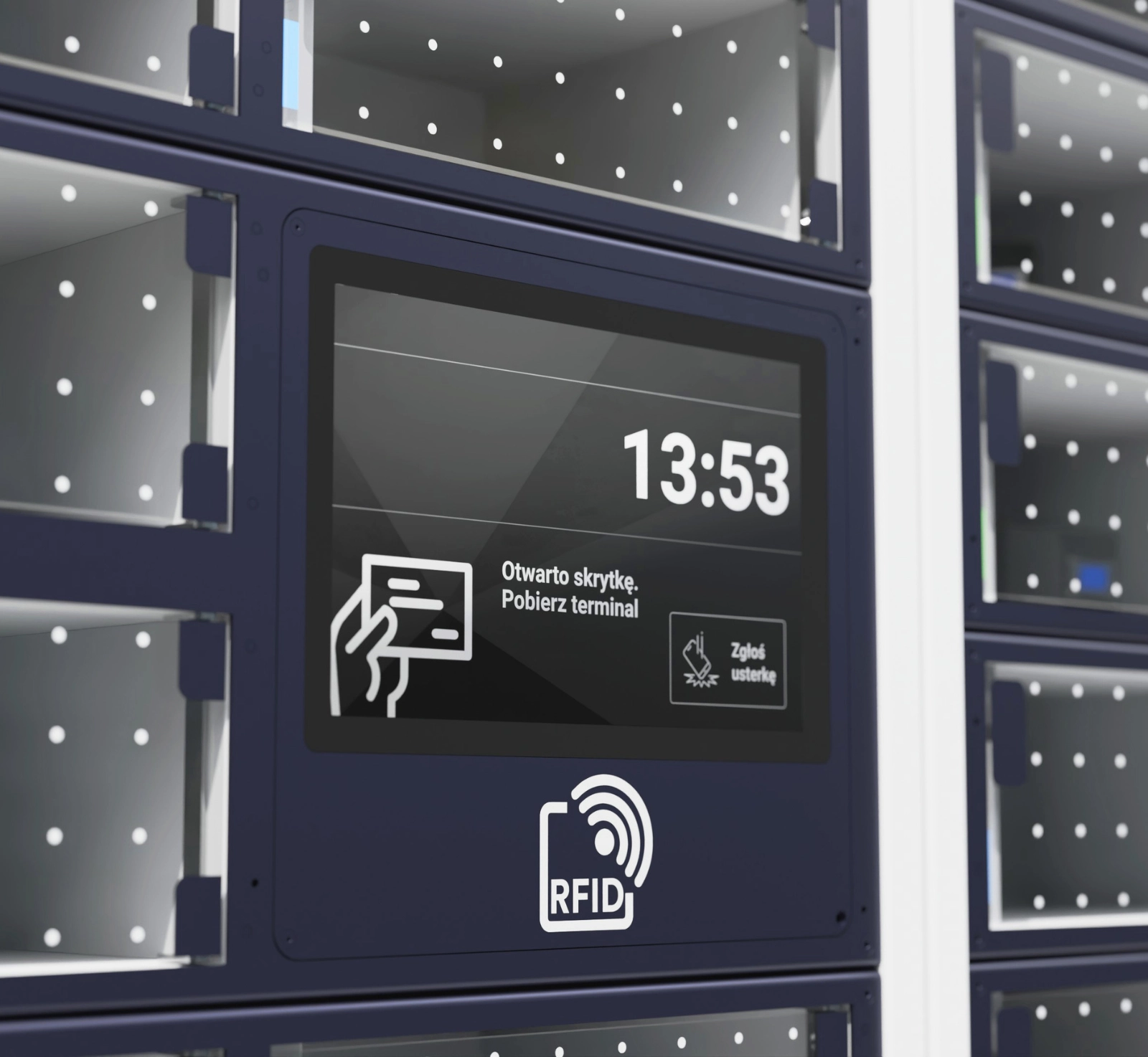 - pobieranie sprzętu - po zalogowaniu system przydziela użytkownikowi urządzenie gotowe do pracy. Otwarcie odpowiedniej skrytki odbywa się automatycznie, a całość trwa zaledwie kilka sekund